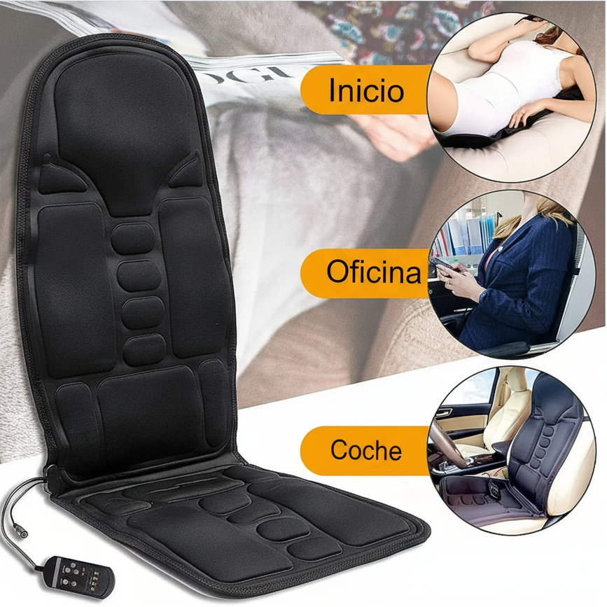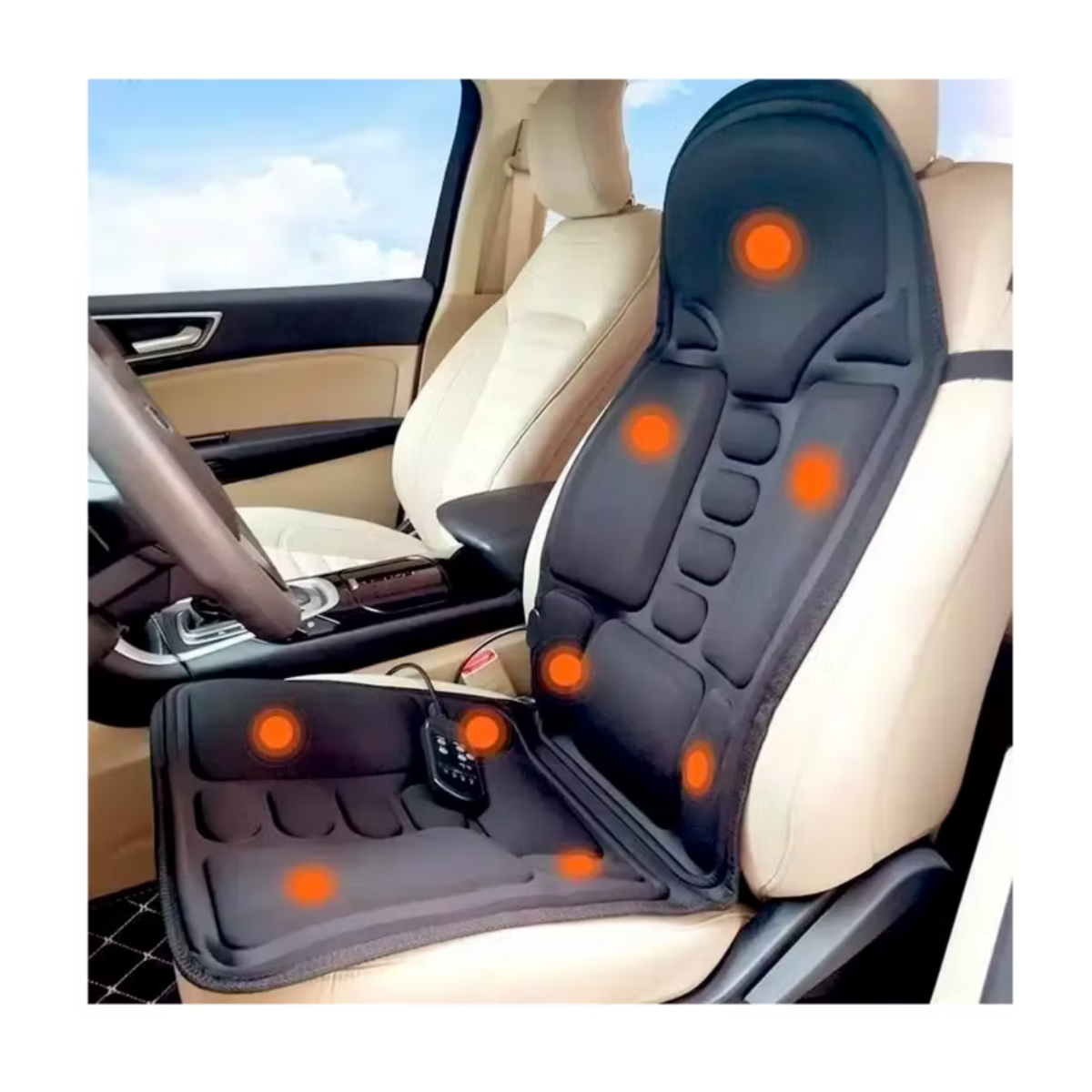 Masajeador vibratorio portátil con 5 niveles de intensidad diseñado para uso en auto o en casa, proporciona alivio muscular.